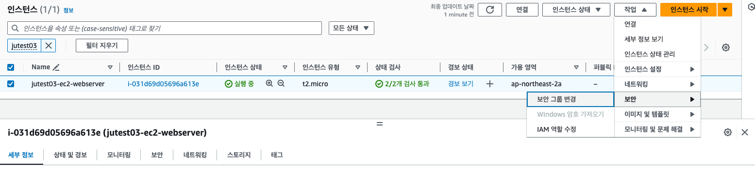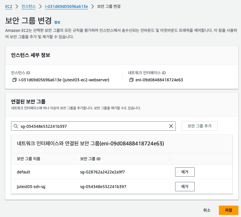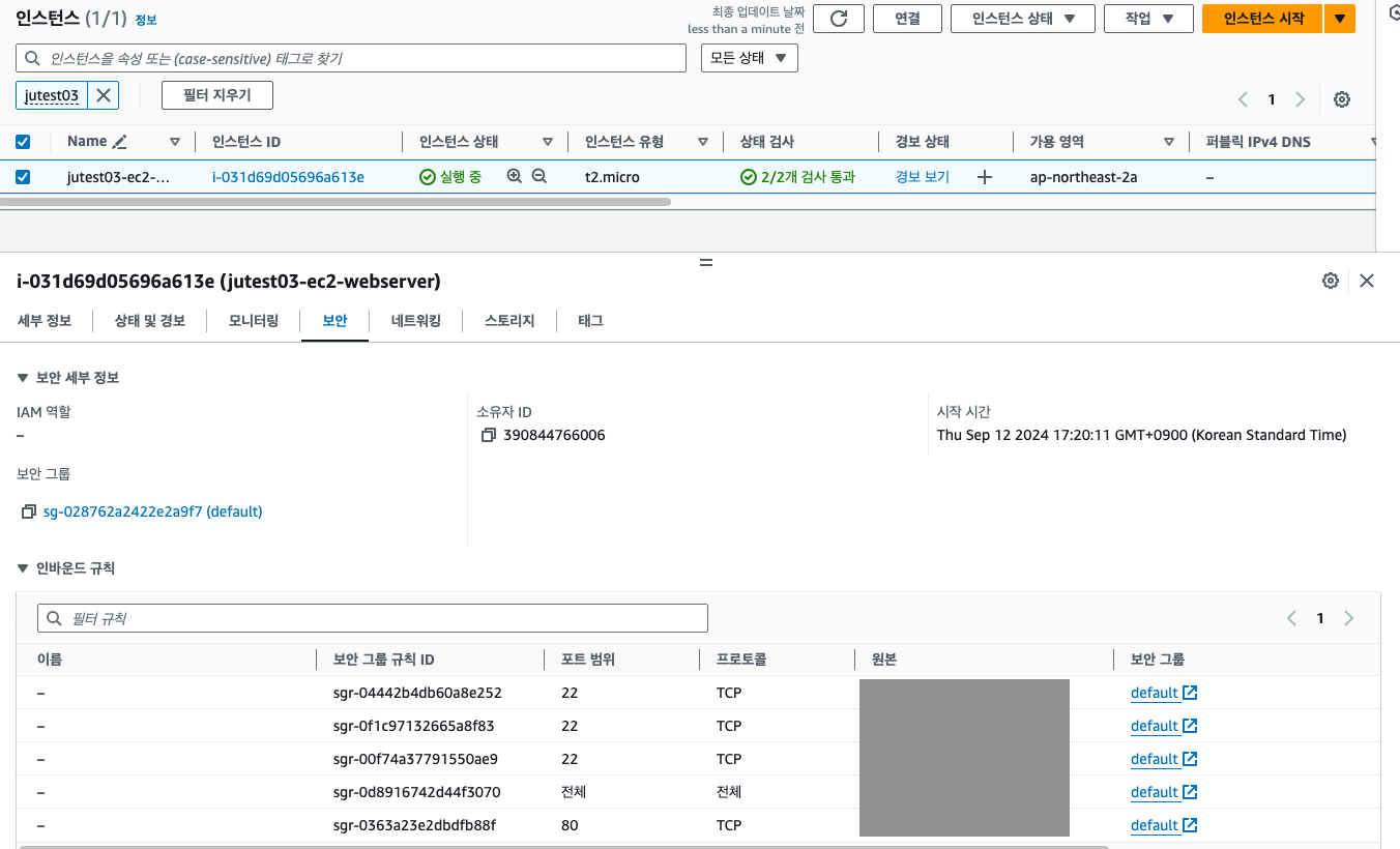 EC2에 설정된 보안 그룹은 jutest03-vpc의 default 보안 그룹으로 설정되어 있어서 VPC의 보안 그룹과 동일합니다.