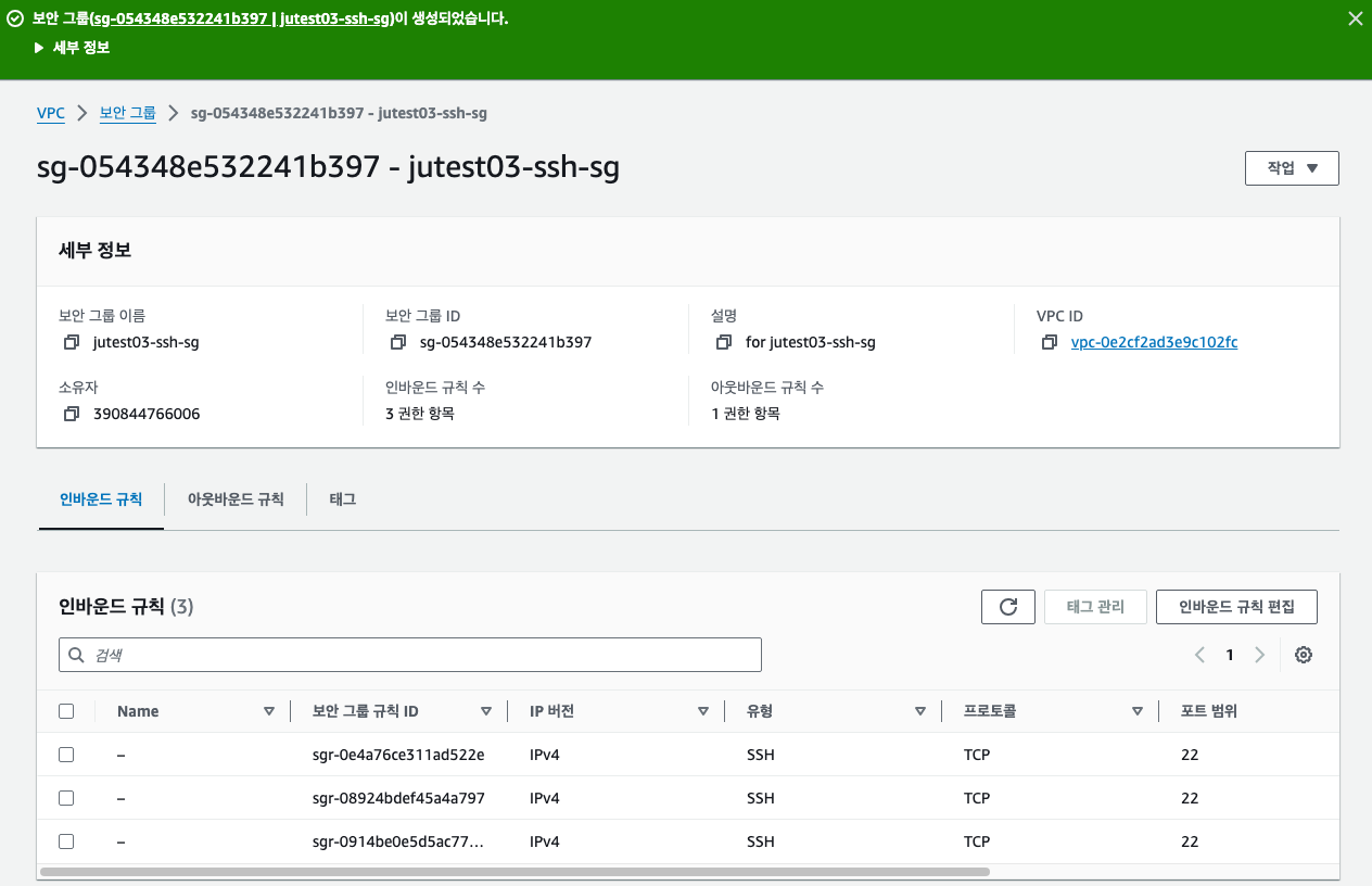 이제 EC2에 등록된 보안 그룹은 jutest03-vpc-sg-default 하나이며, jutest03-vpc-sg-default에 등록된 SSH 트래픽을 처리할 수 있는지 확인해 보도록 하겠습니다.