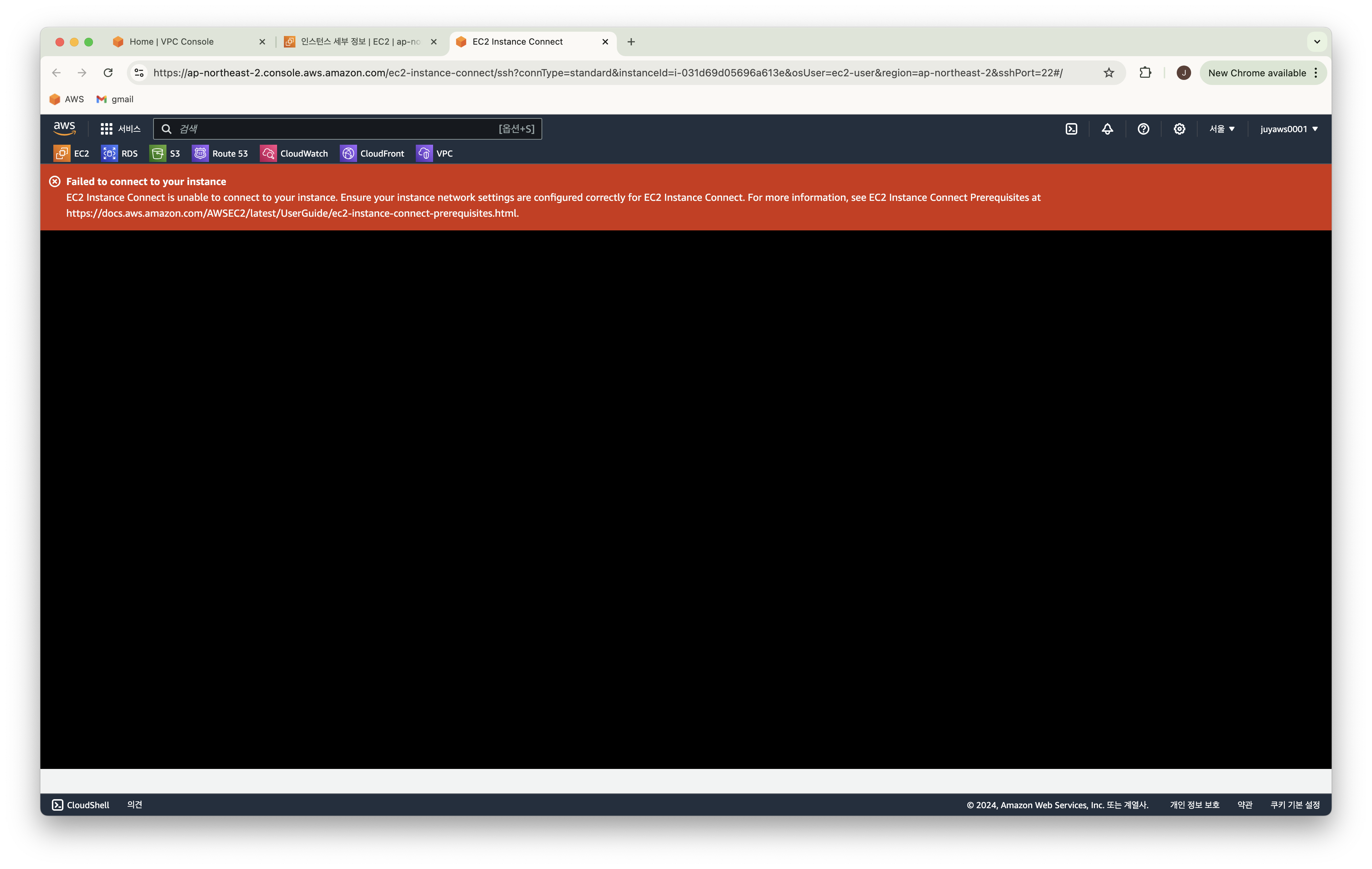 일단 보안 그룹이 잘 적용되었는지 AWS EC2 Connect Service를 이용해서 다시 EC2에 접속이 가능한지 확인해 보자.