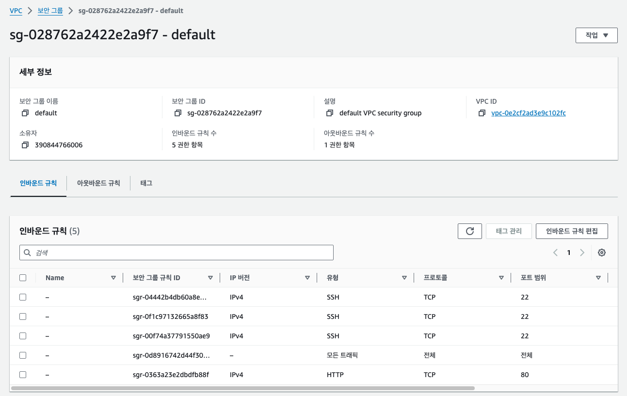 일단 현재 default 보안 그룹에는 SSH 규칙이 여러 개 기 때문에, SSH를 분리해서 작성해 보도록 하겠습니다.